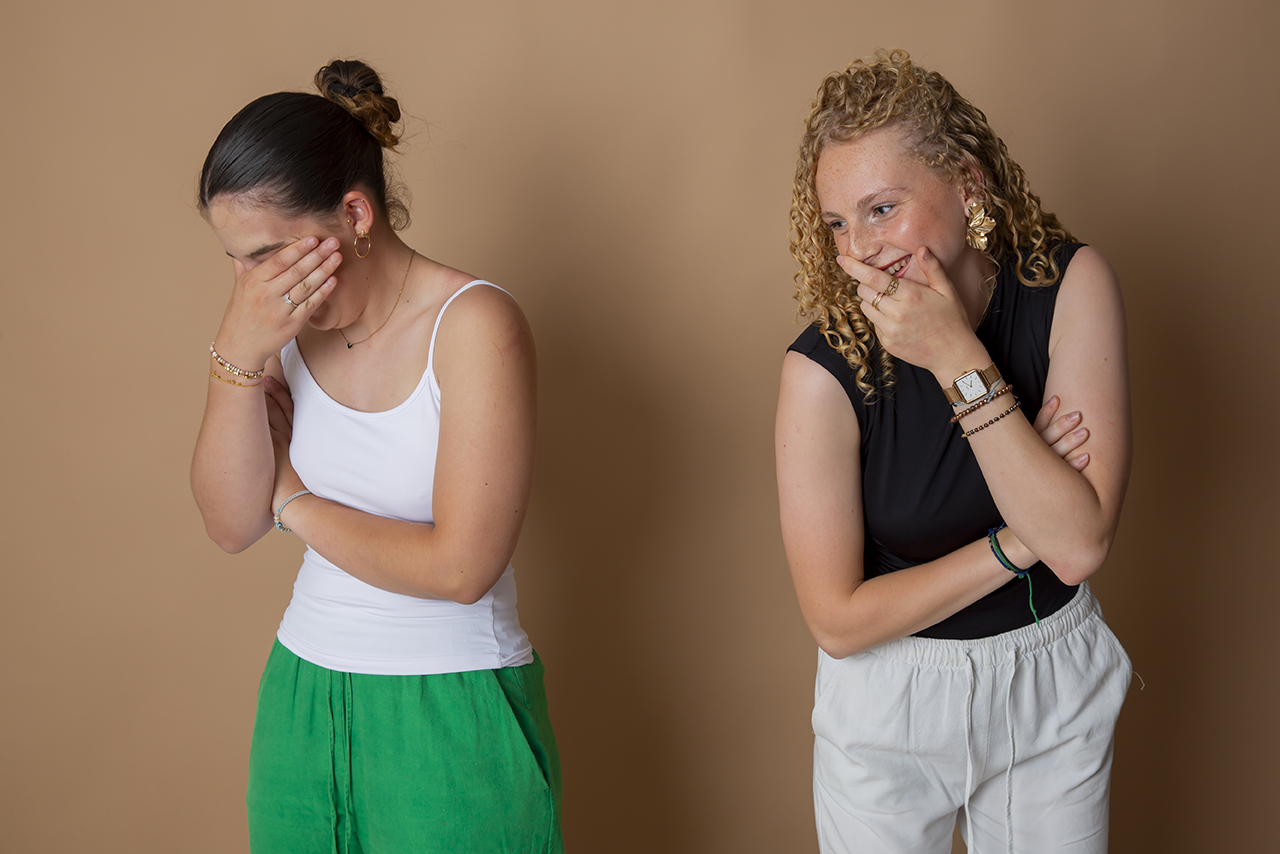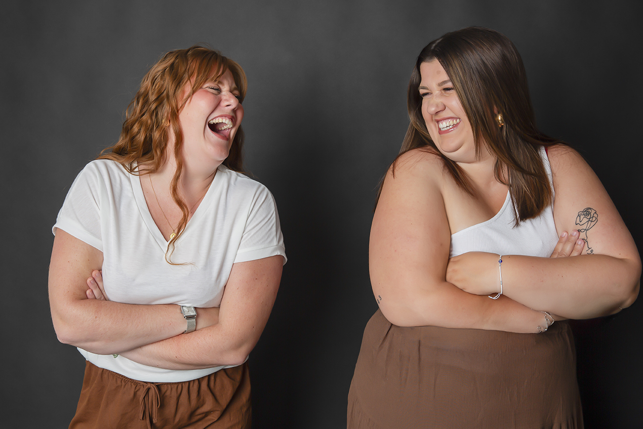 Séance photo entre amies, sur fonds blanc et marron, chez Studios-photo2 à Villeneuve d’Ascq.
