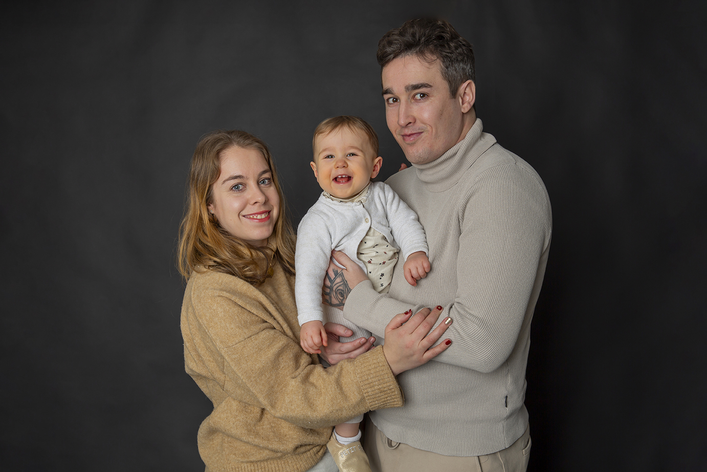 Séance photo de famille. Les parents accompagnés de leur bébé pour se faire photographier sur fond noir.