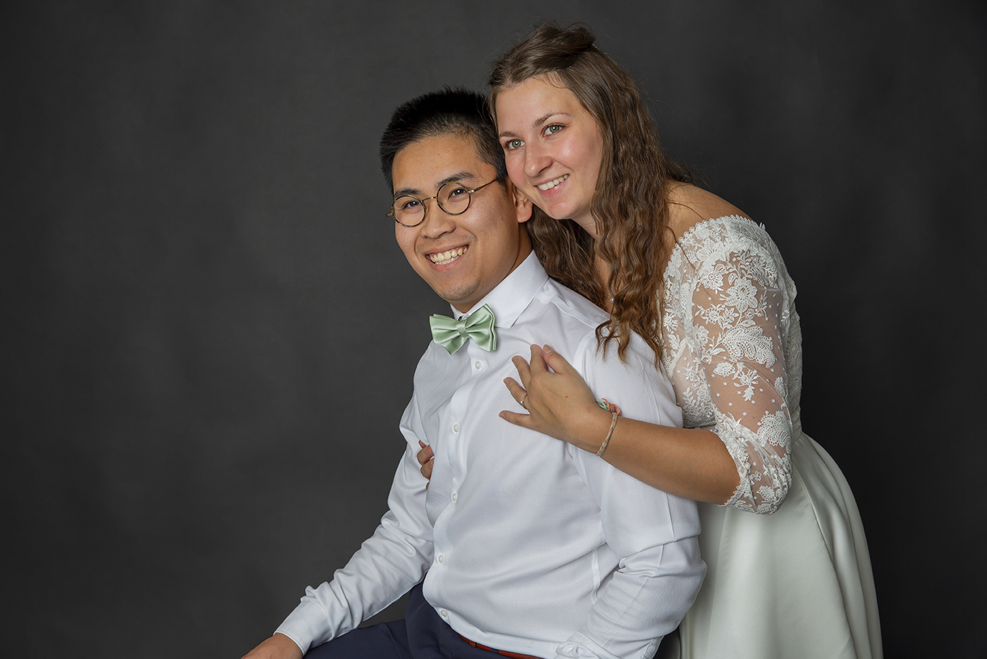 Séance photo d’un couple de mariés, en studio sur fonds marron et noir à Villeneuve d’Ascq.