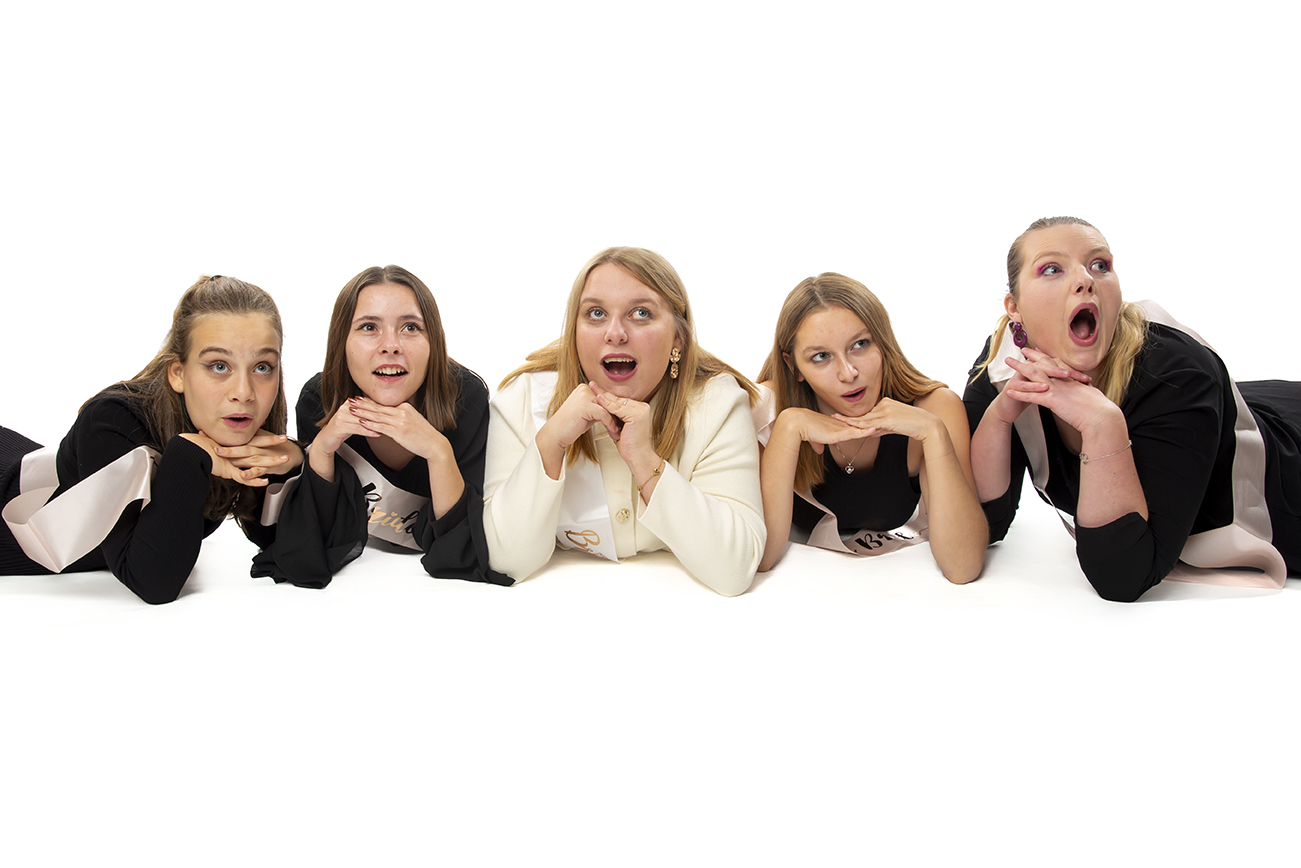 Séance photo d’un enterrement de vie de jeune fille, en studio sur fond blanc.