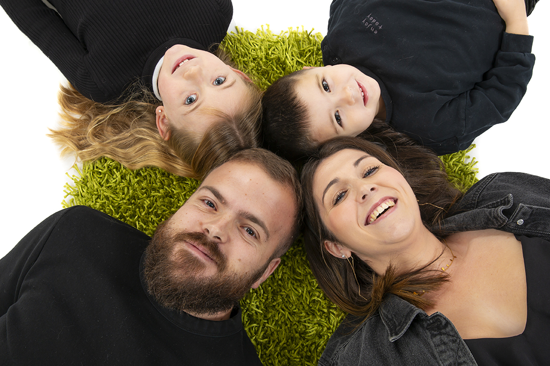 Séance photo de famille. Les parents accompagnés de leurs 2 enfants pour se faire photographier en studio sur fond blanc.