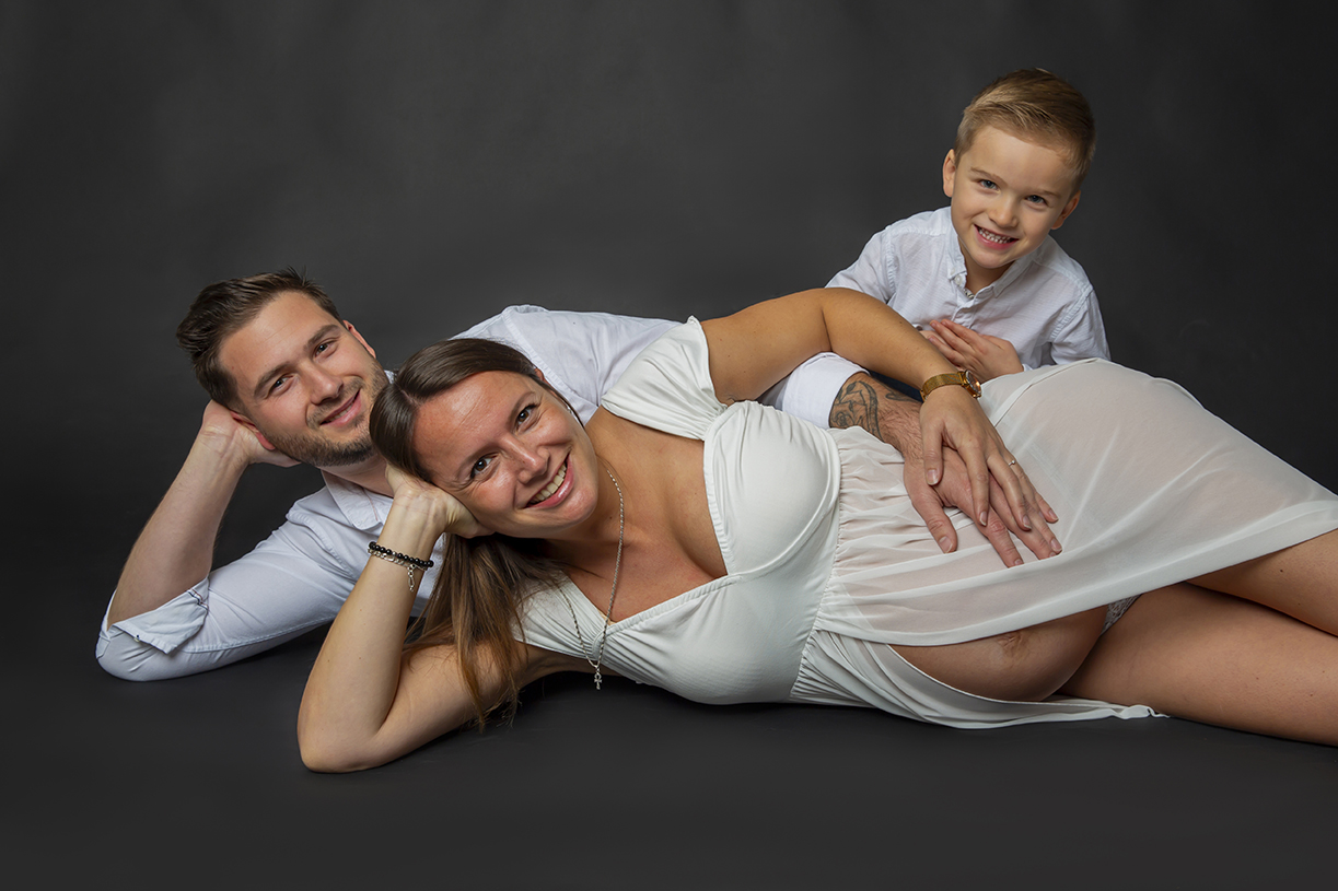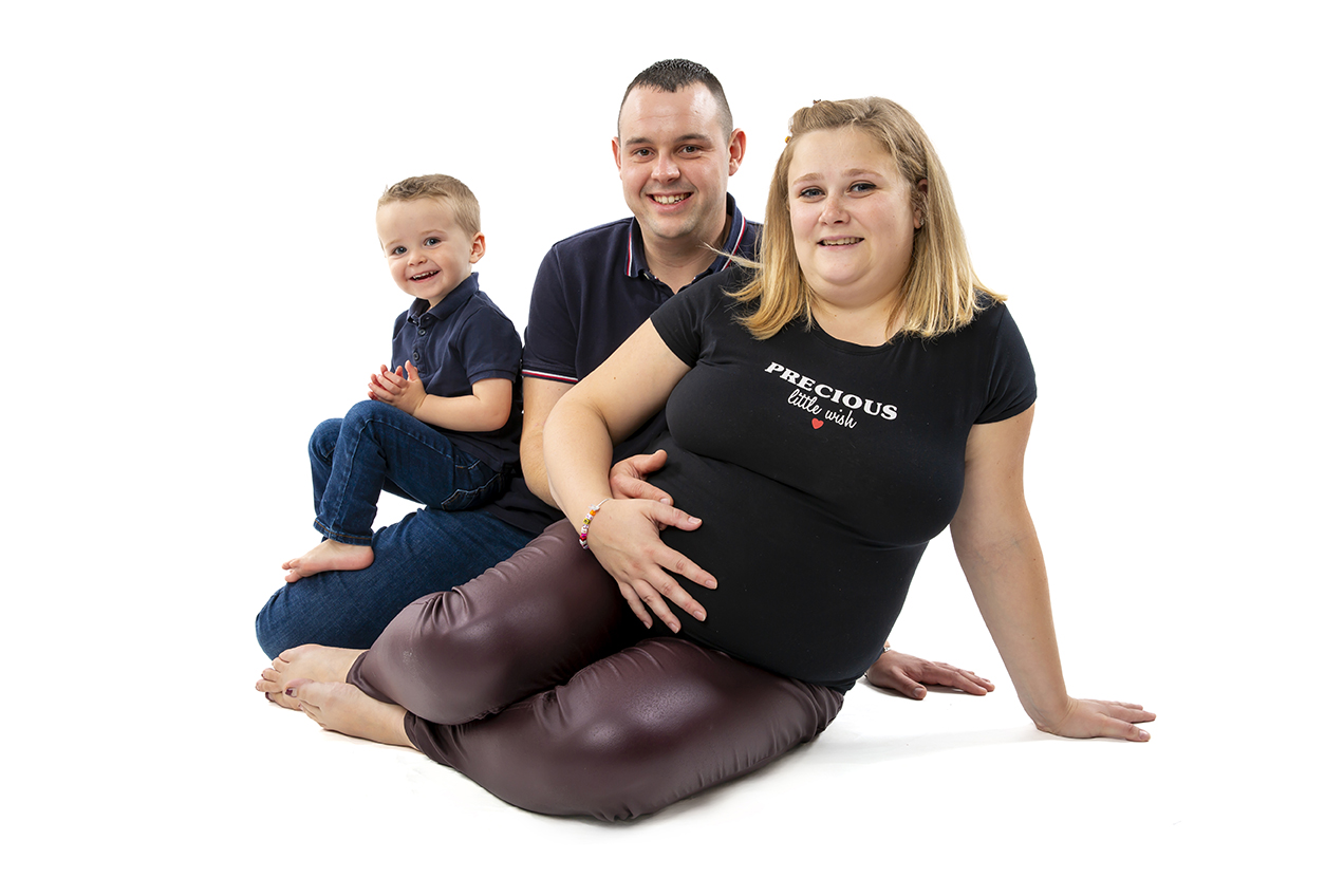 Séance photo de grossesse en famille. Les parents accompagnés de mamie et de leur fils de 2 ans, en studio à Villeneuve d’Ascq.