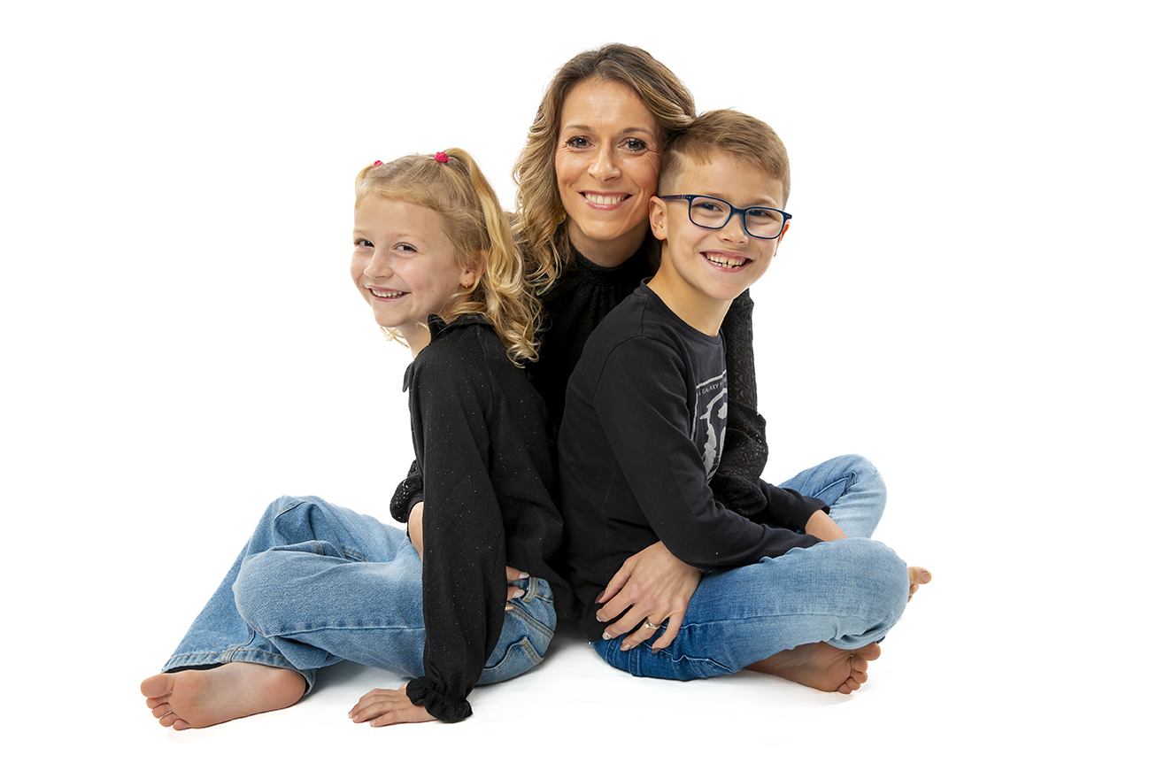 Séance photo de maman accompagnée de ses 2 enfants de 6 ans et 7 ans, pour se faire photographier en studio sur fond blanc.