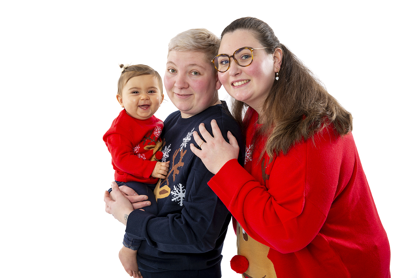 Séance photo de famille. Bébé de 9 mois photographié avec ses mamans en studio à Villeneuve d’Ascq.
