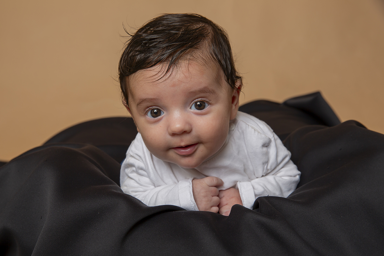 Séance photo de famille. Les parents accompagnés de leur fils de 2 mois, pour se faire photographier sur fond marron.